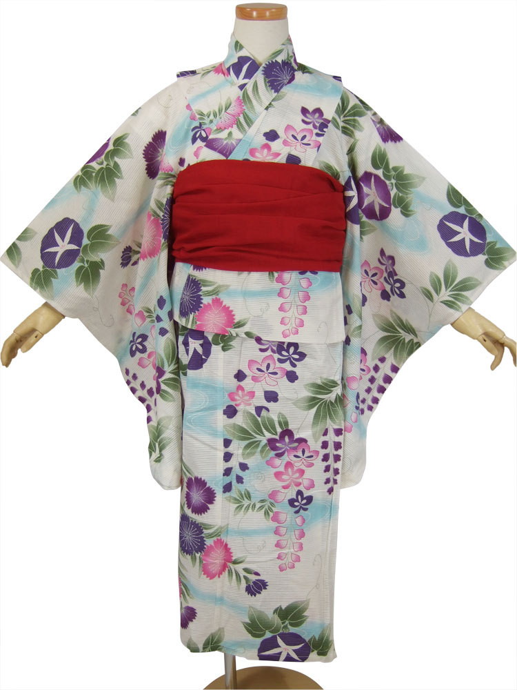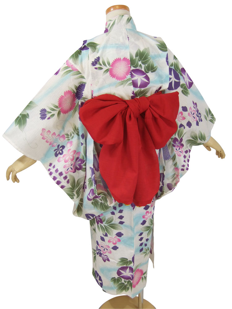 【こだわりの子供浴衣なら「撫松庵ジュニア」!】 白地に藤やなでしこ、朝顔などが描かれたおしゃれな浴衣です。