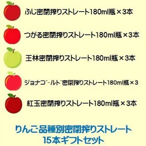 【商品内容】アオレン あおもり旬果物語 りんご品種別180ml×15本入(AR-MK30) りんごの代表品種の「ふじ」、「つがる」、「王林」、「ジョナゴールド」、「紅玉」の100%ストレートジュースを飲みやすい小びんに詰めてセットにしました。